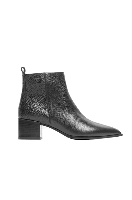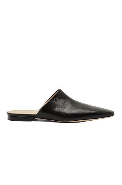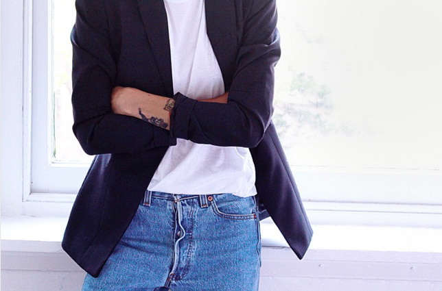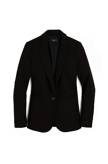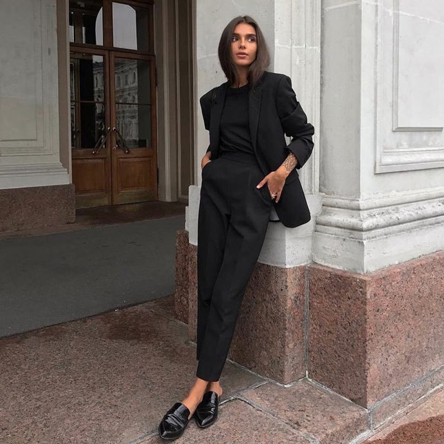 I’m guilty of wearing all black on a regular basis, and adding a black silk blouse to my suit instead of a white one helps me to feel more myself. I pair my all-black suit with a Coach Parker Top Handle bag and Theory Leather Slides.